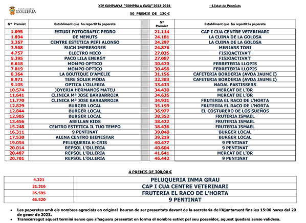 L’acció promoguda per la regidoria de Promoció Econòmica arriba a la seua fi i les paperetes amb els noms agraciats en original després del sorteig ja celebrat hauran de ser presentats davant de la secretaria de l’Ajuntament fins les 15:00 hores del 20 de gener de 2023.