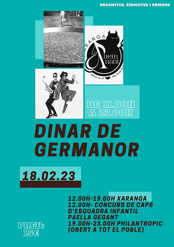 La dinar organitzada aquest any per les filaes Xirigotes i Grisons es desenvoluparà des de les 11 del matí fins a les 23h de la nit. La música anirà a càrrec de la Xaranga (de 12 a 19h) i Philantropic de (19 a 23h). Esdeveniment del que podrà gaudir tot el poble.