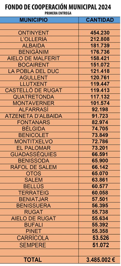 Martes 18 de junio de 2024.- Los municipios de la Vall d’Albaida recibirán un 8% más, los de la Costera un 9% más y los de la Canal de Navarrés un 8% más en la primera entrega de la Diputació de València al Fondo de Cooperación de 2024, en relación al primer pago del pasado año. Por comarcas, La Vall d’Albaida tiene asignados 3.485.000 euros, desde los 454.000 euros de Ontinyent hasta los 51.000 euros de Sempere, el menos poblado; la Costera 2.355.000 euros, desde los 415.000 euros que corresponden a Xàtiva hasta los 54.000 de Estubeny; y la Canal de Navarrés 844.000 euros, desde los 161.000 de Enguera hasta los 61.000 de Millares. A esta entrega se sumará una nueva aportación que completará los 60 millones de euros presupuestados por la corporación provincial para dotar el Fondo en el presente ejercicio.