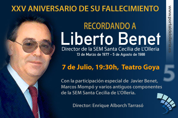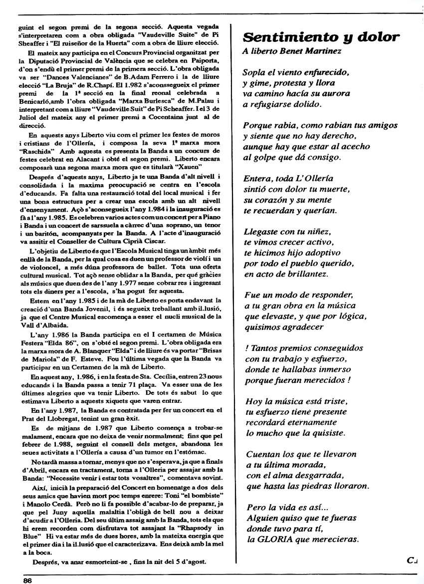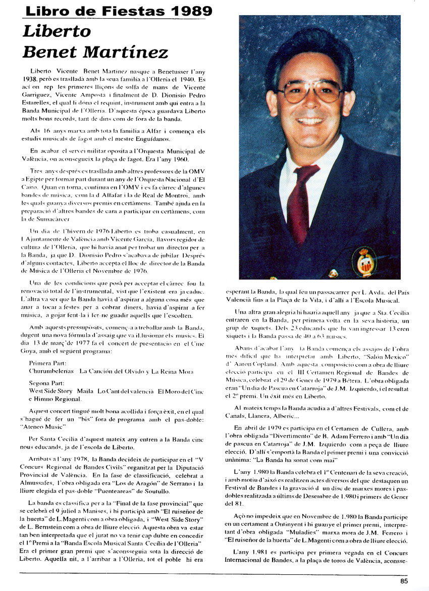 Amb motiu del XXV aniversari de la mort de Liberto Benet, director de la SEM Sta Cecília de l’Olleria, i fins a la celebració del “XXI Festival Liberto Benet”, s’aniran reproduint en aquest portal un seguit d’articles i entrevistes obra i cortesia de Pepe Aparici. Avui reproduïm dues cròniques del Llibre de Festes. L’última de Liberto en el llibre de 1988, i la primera “in memoriam”, del llibre de 1989.