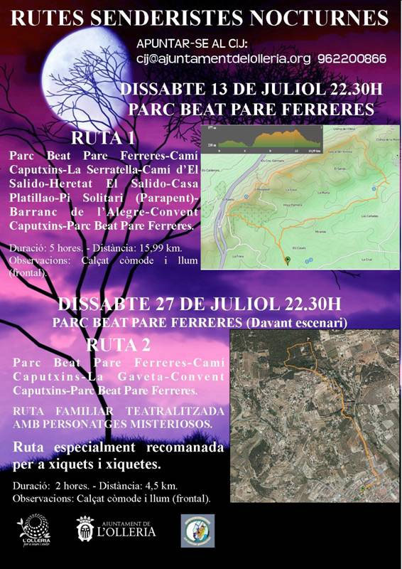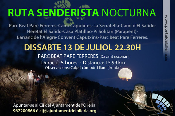 El dissabte 13 de juliol es celebra el primer dels dos circuits de la “Ruta Senderista Nocturna“, es recorda una vegada més als participants, que acudisquen amb calçat còmode (apropiat per caminar llargues distàncies) i una llanterna. La propera sortida serà el dissabte 27 de juliol amb la ruta que s’exposa en el següent cartell de l’esdeveniment: