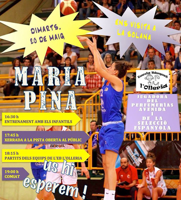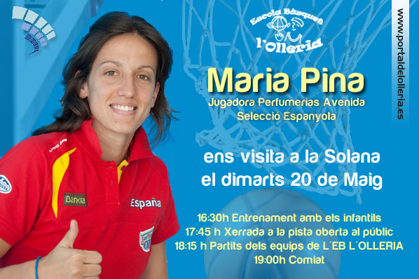 L’Escola de Bàsquet de l’Olleria , rep aquest dimarts 20 de maig la visita de la Maria Pina , jugadora del Perfumerias Avenida i de la Selecció Nacional de Bàsquet Femení. La visita es realitzarà al pavelló de la Solana . a partir de les 16:30 h, on s’entrenarà amb els infantils de l’escola , al voltant de la 17:45 h , hi haurà una xerrada oberta a tot el públic . Mitja hora més tard es podran veure partits entre equips de l’escola , per arribar al comiat de tan il · lustre jugadora .