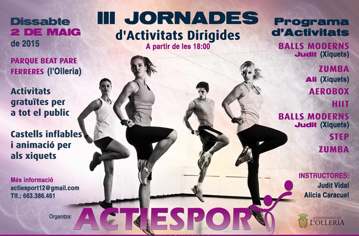 El proper dissabte 2 de maig, Actisesport organitza les III jornades dirigides per a tots els públics. Les activitats principals seran ball modern, zumba, aerobox i step. La jornada se celebrarà al parc Ferreres, a partir de les 18:00 h. Per als més petits, hi haurà castells inflables i animacions.