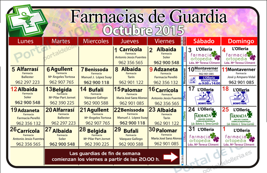 Puede consultar todas las guardias hasta fin de año en www.olleria.net/farmacia.htm