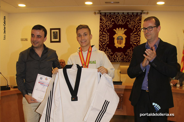David Tolsá, accede a este homenaje después de conseguir el pasado 26 de septiembre la medalla de plata en el Campeonato Nacional Junior, celebrado en Alicante. Además de firmar en el libro de honor, le fué entregado un nuevo dobok de combate. El Ayuntamiento también hizo extensivo el homenaje al maestro Fernando Arjona, al equipo técnico de combate, compuesto por Ramón Sanz, Ximo Cuenca y David Ureña (ausente), Neus Arjona, monitora de la Escuela Municipal de Taekwondo (la base de los jovenes deportistas). Todos ellos recibieron un nueva camiseta de entrenadores de la Escuela Municipal. También Mireya Giner, otra joven promesa del taekwondo local, que a sus 15 años ya cuenta con una beca deportiva en Cheste se le hizo entrega del Cinturón Negro por mérito deportivo.