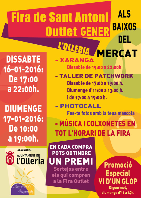 FERIA SAN ANTONIO OUTLET. Este fin de semana Ollería celebrará la Feria de San Antonio Outlet. Aprovechando la festividad de San Antonio, en la que hay actividades y la gente se moviliza más al pueblo, el sábado y el domingo, en los bajos del mercado, se celebrará esta feria. Vicente Albinyana, Concejal de Empleo y Promoción Económica, explicaba en una rueda de prensa que en el recinto habrá muchas actividades para hacer de la visita a la Feria una Actividad agradable y entretenida para todos. La Feria abrirá sus puertas el sábado de 17:00 a 22:00 y el domingo de 10:00 a 19:00 horas. Aparte de la propia actividad comercial, habrá taller de patchwork, castillos hinchables para los niños, música, etc. Además cada cierto tiempo se realizarán sorteos por parte de los comerciantes, y habrá premio para la mejor foto del photocall. Vicente Albinyana explicado que «en la feria se encontrarán productos a precios muy interesantes, y consideramos que esta actividad reactivará el comercio local en rebajas. Invitamos a todos los vecinos de l’Olleria, y de las localidades de alrededor a venir y pasar un rato agradable, a la vez que colaboran con el comercio del pueblo «. Asimismo ha añadido que «este tipo de actividades impulsadas por el Consejo de Hosteleros y Comerciantes siempre serán bien recibidas por parte del Ayuntamiento, y seguiremos trabajando para seguir potenciando el comercio de l’Olleria».