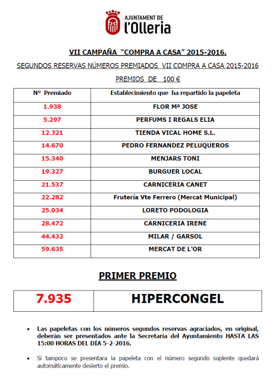 Las papeletas con los números segundos reservas agraciados, en original deberán serpresentados ante la Secretaría del Ayuntamiento hasta las 15 horas del día 5 de febrero de 2016.