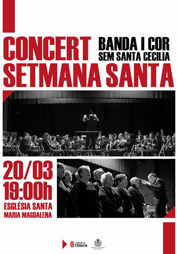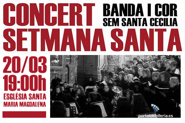El próximo domingo, 20 de marzo, se celebrará el Concierto de Semana Santa, a cargo de la Banda y Coro de la SEM Santa Cecilia con la participación del «Cor Veus de la Safor», de Gandía, y el «Orfeó del Real de Gandía». El evento será a las 19:00 h en la Iglesia Parroquial.