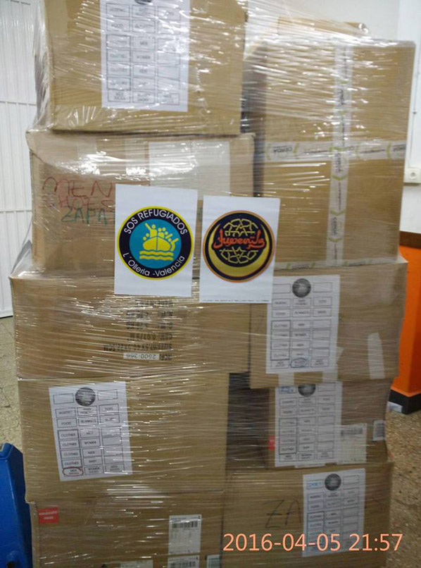 Se montaron 20 palés de material aún después de descartar contribuciones que no se ajustaban al perfil deseado, principalmente alimentos derivados del cerdo, vestuario descartado por motivos religosos, ya que practicamente la totatilad de los refugiados son musulmanes, (no están bien vistos, los zapatos de tacón, o ropa obstentosa). Todas estas contribuciones fueron derivadas a la Parroquía (Cáritas). También han recibido contribuciones económicas, que serán destinadas a pagar parte del transporte de Barcelona hasta Grecia. De l’Olleria a Barcelona, se encargó la empresa de transportes Seur, que también participa en este proyecto.