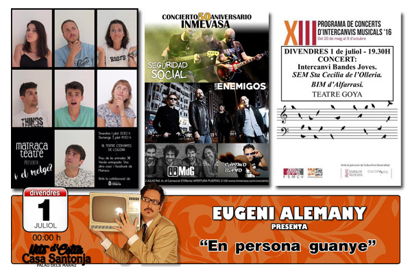 00:00 h Casa Santonja: Inicio de las «Nits d’estiu» con la actuación de Eugeni Alemany con su espectáculo : «en persona guanye».