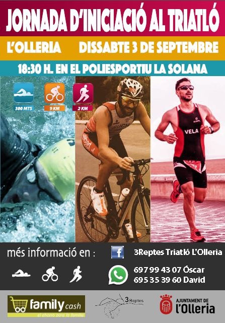 Per al proper dissabte 3 de setembre el Club 3 Reptes de l’Olleria ha organitzat una jornada d’iniciació al Triatló amb l’objectiu que la gent conega un poc més este esport i s’anime, en un moment donat, a practicar-lo. ‘La jornada que hem preparat és gratuïta i en ella pot participar tot el que vullga, és més hem intentat que la prova siga més o menys fàcil perquè pràcticament qualsevol persona puga fer-la’, explica Jordi Sebastià President del Club triatló 3 Reptes. Els joves de 16 a 18 anys també poden participar amb l’autorització dels pares.