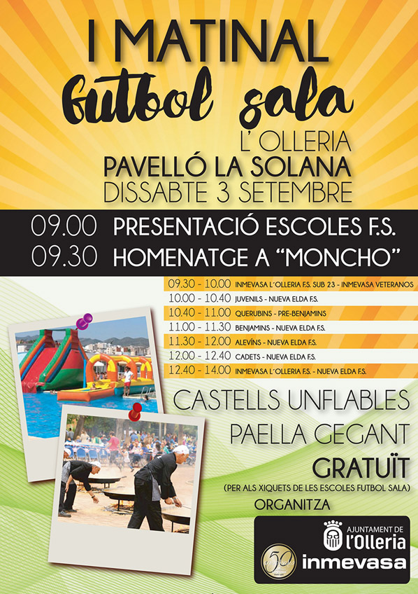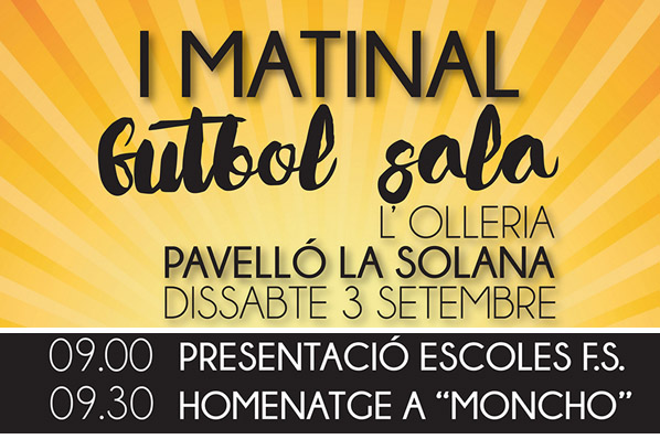 Demà dissabte 3 de setembre es celebrarà la Presentació de l’Escola municipal de Futbol Sala al Pavelló de La Solana. L’acte començarà a les 9 de matí amb la presentació dels diferents equips, després es farà un reconeixement per la seua dedicació al futbol sala a ‘Moncho’.
