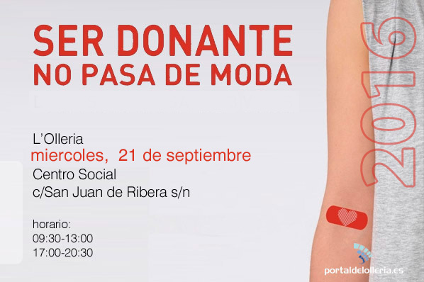 El próximo miercoles 21 de septiembre, la unidad móvil del “Centre de Transfusió” de la Generalitat Valenciana se trasladará a l’Olleria. La donaciones se podrán realizar en el Centro Social de la calle San Juan de Ribera, de 9:00 a 13:00 h y de 17:00 a 20:30 h.