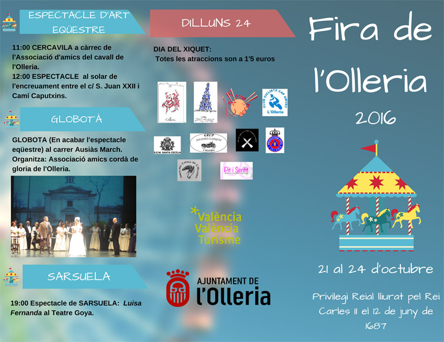 Este fin de semana llega la Feria en Ollería, y lo hace cargada de actividades para todos los públicos. La inauguración será el viernes a partir de las 20:30, la comitiva oficial saldrá de la Plaza de la Virgen del Loreto e irá acompañada de la SEM Santa Cecilia de L’Olleria. Durante el recorrido hasta la Feria actuarán el Grupo de Danzas el Revol, el Ball dels Locos y la Colla La Morralla.