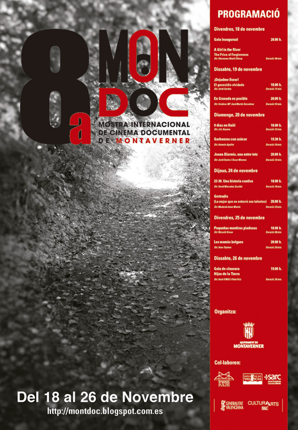 La Concejalía de Cultura del Ayuntamiento de Montaverner ha publicado la programación de MON · DOC 2016, que arrancará el viernes 18 de noviembre con la proyección del documental ‘A girl in the river: the price of Forgiveness’, galardonado con el Oscar 2016 en mejor corto documental y que no se había proyectado todavía en nuestro país. Sábado 26 se cerrará la muestra con la otra proyección fuera de concurso, ‘Hijos de la Tierra’, premiado con el Goya 2016 al mejor corto documental, dos trabajos premiados y reconocidos por la crítica especializada que acercan el mejor cine documental en Montaverner.