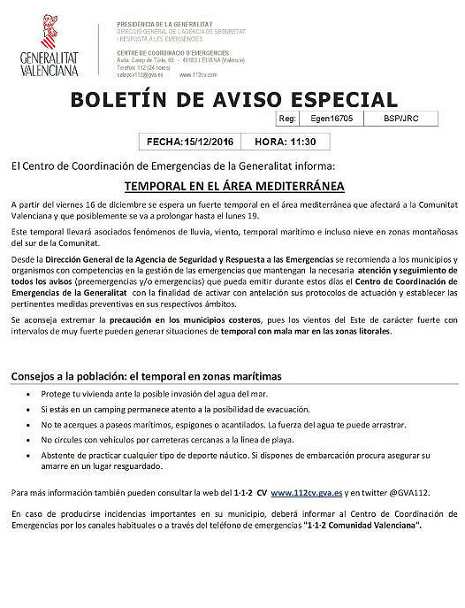 Centro de Coordinación de Emergencias de la Generalitat informa que a partir del viernes 16 se espera un fuerte temporal que seguramente se prolongará hasta el lunes 19. El temporal llevará asociados fenómenos de lluvia, viento e incluso nieve en zonas montañosas del sur de la Comunitat.