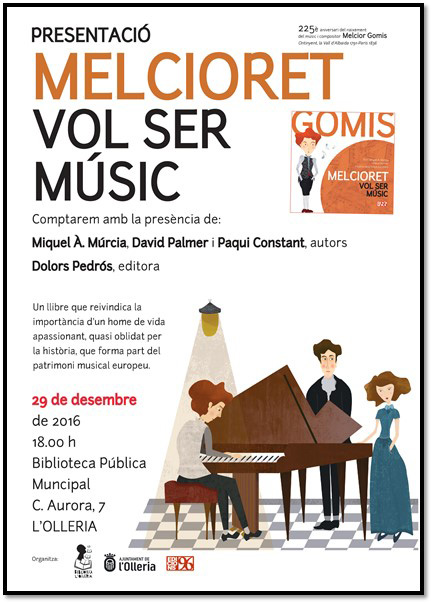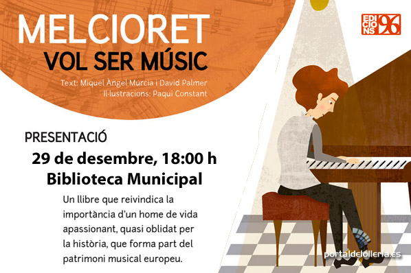 Biblioteca Pública de l’Olleria, presentación del libro «Melcior vol ser music», 29 de diciembre a las 18:00h. Participaran en la presentación Miquel Àngel Múrcia y David Palmer, y la ilustradora Paqui Constant, que relata la vida del compositor de Ontinyent Melchor Gomis.