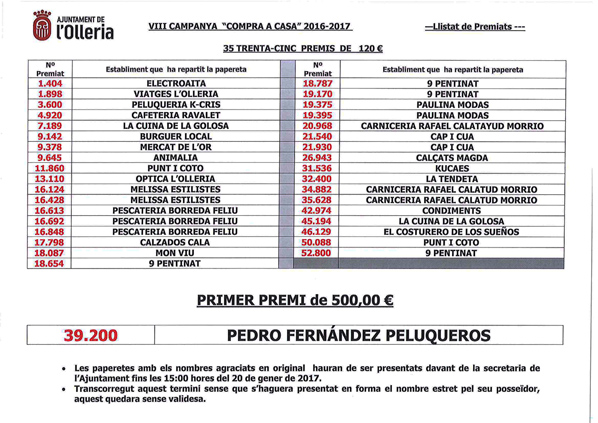Adjuntem la llista amb els números premiats i l’establiment que l’ha repartit: NUMEROS PREMIATS VIII CAMPANYA COMPRA A CASA 2016-2017.pdf