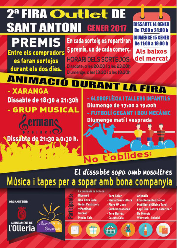 Paralelamente, también está previsto para el mismo fin de semana, la celebración de la «II Fira Oulet de Sant Antoni» en los bajos del mercado. El sábado estará abierta de las cinco de la tarde hasta las doce de la noche. El domingo de desde las 11 de la mañana hasta las siete de la tarde. Además de varias atracciones (ver cartel al final de la noticia), destacar la actuación de la Xaranga y del grupo musical Germans en la tarde noche del sábado.