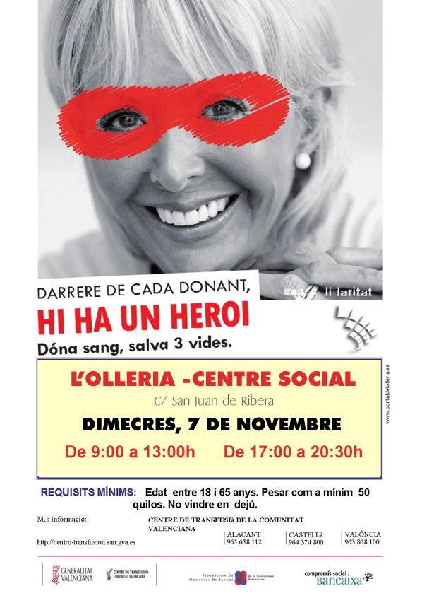 El miercoles, 7 de Noviembre, estará el autobús de extracción de sangre, en el Centro Social de l’Olleria, c/ San Juan de Ribera, por la mañana de 9:30 a 13:00 h y por la tarde de 17:00 a 20:30 h.