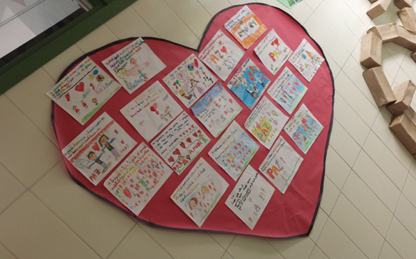 La setmana passada, el nostre col·legi, CEIP Manuel Sanchis Guarner de l’Olleria, va celebrar el Dia Internacional de la Pau mitjançant l’elaboració d’uns gràfics de gran tamany disposats al llarg dels corredors del centre. Aquests estaven elaborats amb els missatges, definicions, idees i expressions de Pau de tots els alumnes del centre, acompanyant a l’escrit un dibuix. Podem veure cors, un colom, el símbol de la Pau i el símbol de la Victòria.
