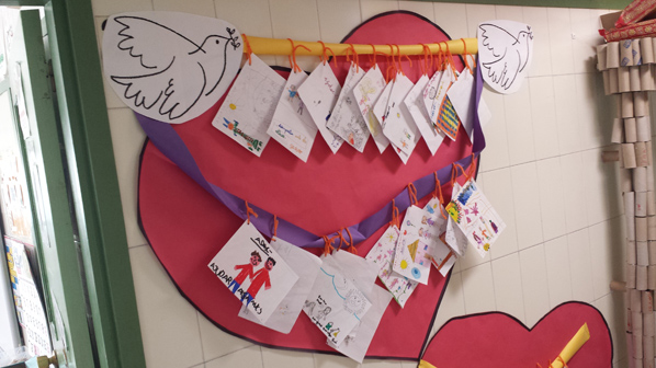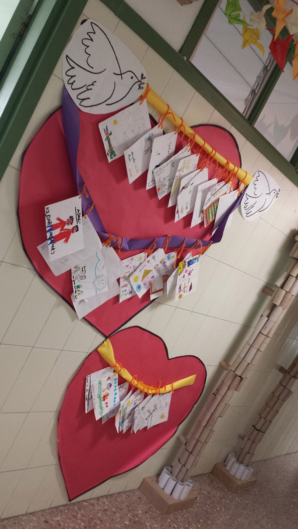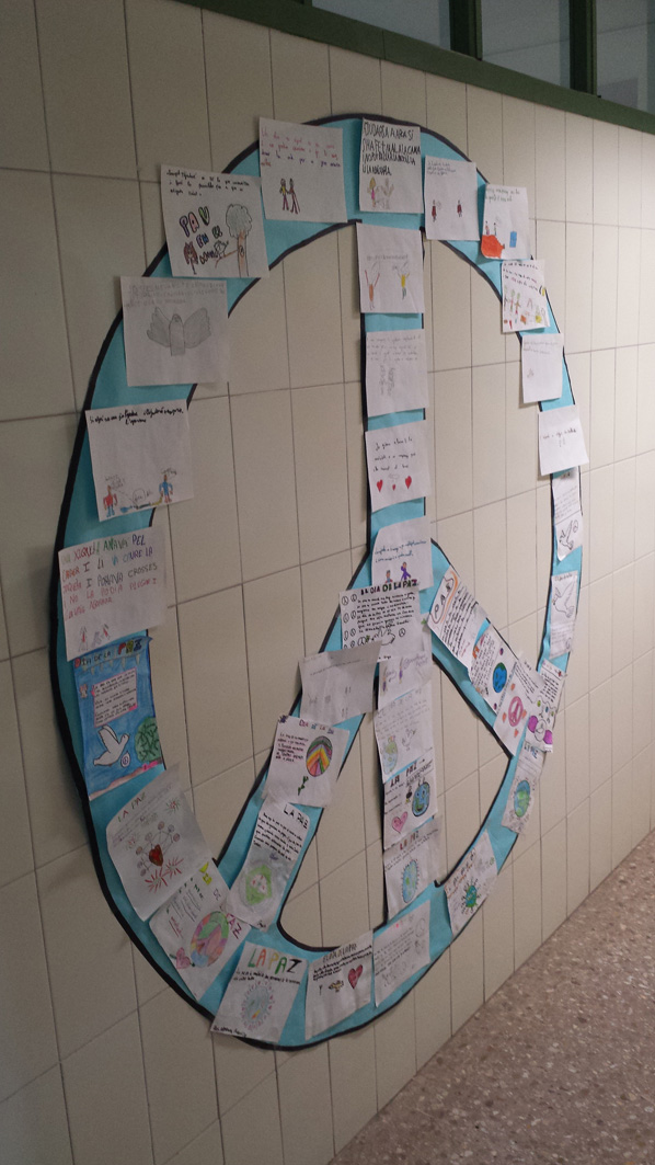 La semana pasada, nuestro colegio, CEIP Manuel Sanchis Guarner de l’Ollería, celebró el Día Internacional de la Paz mediante la elaboración de unos gráficos de gran tamaño dispuestos a lo largo de los corredores del centro. Estos estaban elaborados con los mensajes, definiciones, ideas y expresiones de Paz de todos los alumnos del centro, acompañando al escrito un dibujo. Podemos ver corazones, una paloma, el símbolo de la Paz y el símbolo de la Victoria.