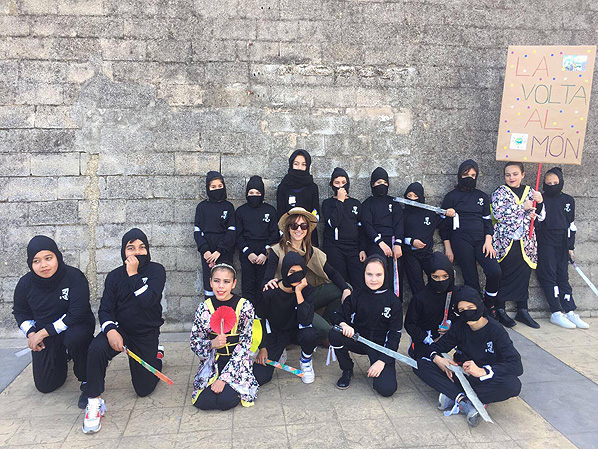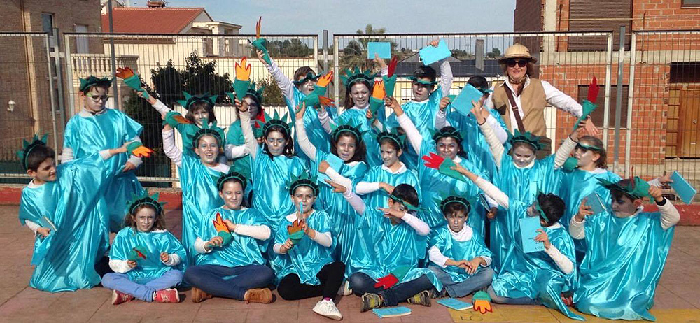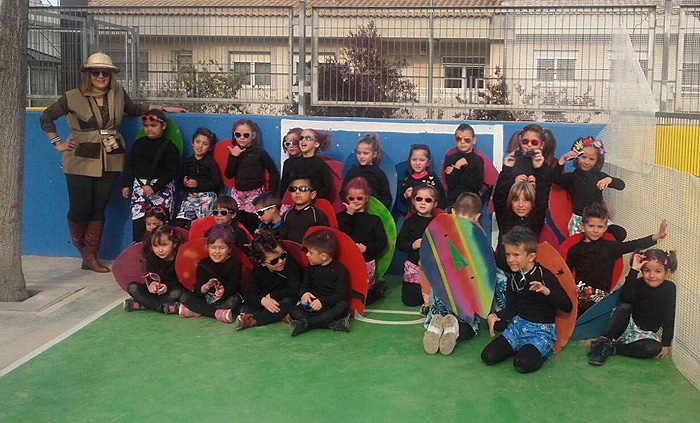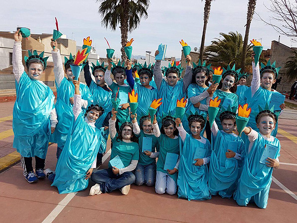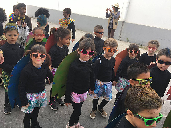 En infantil: (continente Oceanía) iban de canguros polinesios y surfistas. En el primer ciclo (continente África) iban de tribus africanas. En el segundo ciclo (continente América) iban de Mexicanos, Fruda Kahlo y de estatua de la Libertad.En el tercer ciclo (continente Asia) iban de Ninja y Geisha. Y todos los maestros iban de exploradores.