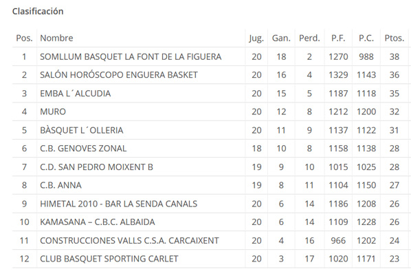El primero de los encuentros se disputó el viernes contra el Enguera Basket en el pabellón de El Ravalet. Las bajas y sobre todo la falta de acierto decantaron el resultado a favor de los de Enguera (49-58), que mantienen su particular «persecución» al líder (La Font de la Figuera).