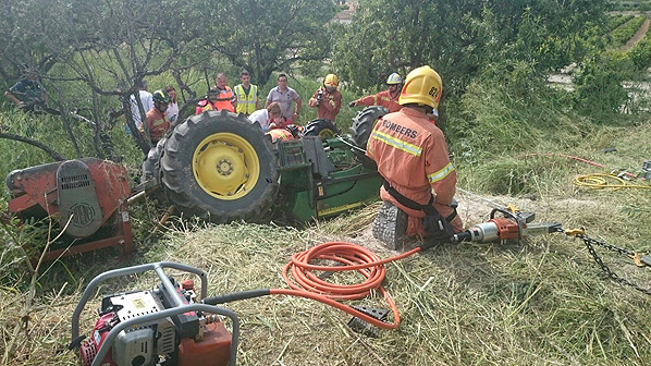 Los hechos ocurrieron en un campo cercano a la residencia Solimar, en la subida hacía el camino de Benigànim. El hombre, de unos 51 años quedó atrapado por una pierna al volcar el vehiculo que manejaba. Fué necesaria la intervención de un camión grúa para izar el tractor y poder así rescatar el herido. En primera instancia la unidad del SAMU lo asistió por una quemadura y aplastamiento de la pierna derecha, trasladándolo al Luis Alcañiz para un valoración más precisa.