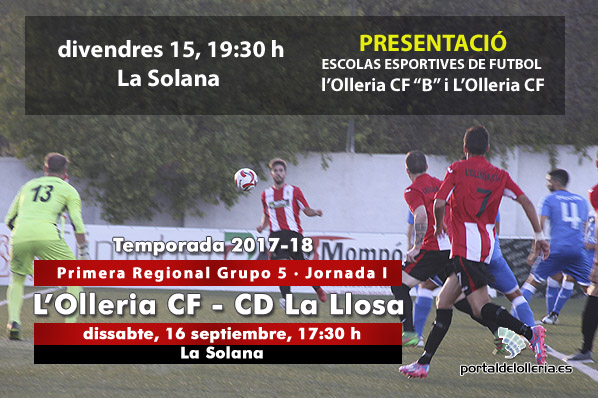 Este viernes a partir de las 19:30 h, el fútbol olleriense tiene su cita en la presentación de las plantillas de la Escuela de Futbol Base, y de l’Olleria CF, primer equipo y filial. La presentación como viene siendo habitual se realizará en el campo de La Solana. Además de reunir a los aficionados de todas las categorias, es una ocasión idónea para conocer todas las novedades del primer equipo, ya que esta temporada cuenta con numerosas incorporaciones. Este año además de la presentación se realizará un homenaje a todos los presidentes que tuvo L’Olleria CF.