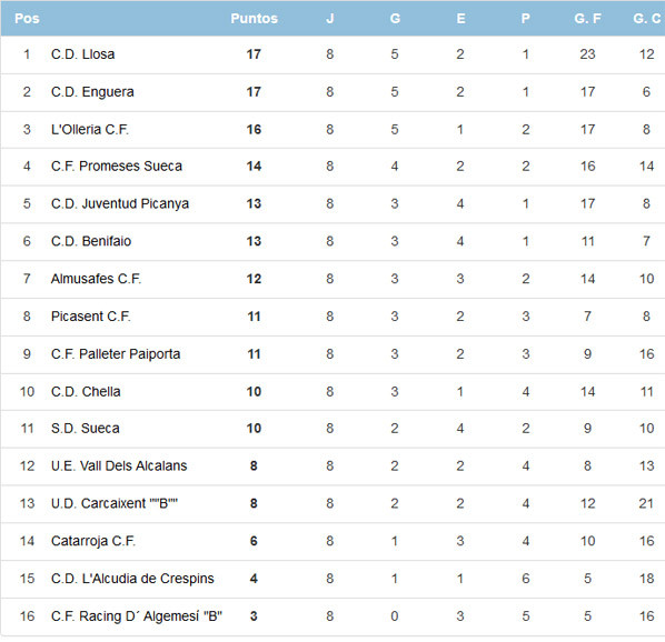 L’Olleria CF, consigue un importante triunfo en su visita al campo de la SD Sueca. La victoria, combinada con otros resultados en la parte alta de la tabla, convierte a L’Olleria (junto con el CD La Llosa), en uno de los equipos más beneficiados de la jornada 8ª dentro de este competido Grupo V de primera regional.