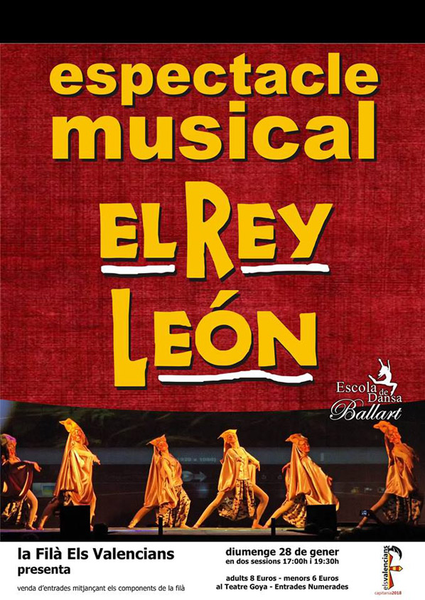 Organizado por Filà Valencians (capitanía cristiana), y la colaboración del Ayuntamiento, este domingo llega al teatro Goya, la adaptación musical del “El Rey León”, a cargo de la “Escola de Dansa Ballart” de Canals.