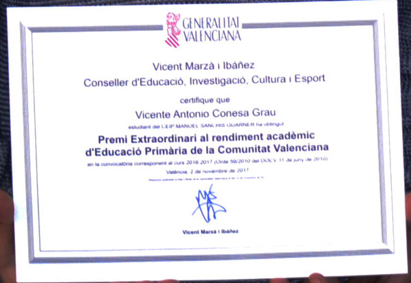 En la cerimònia celebrada el passat dia 26 de Març de 2018 a València (Palau de les arts Reina Sofia), Vicente Conesa Grau, qui fora alumne de primària del CEIP Manuel Sanchis Guarner, va rebre el Premi Extraordinari al Rendiment Acadèmic d’Educació Primària corresponent al curs 2016/2017 (6é de primària), que ve a reconèixer el gran mèrit, l’esforç i l’excel·lència de Vicente.