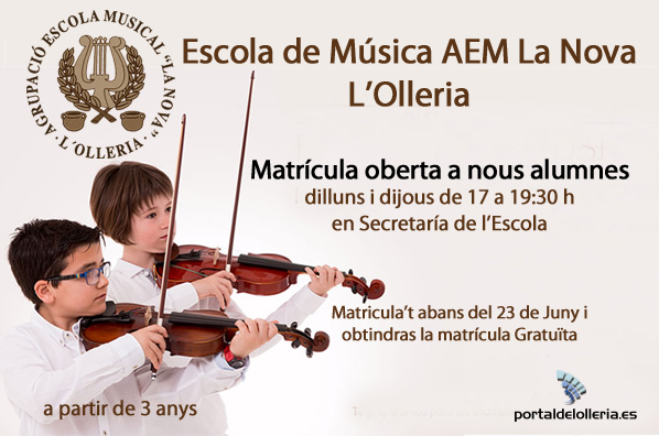 Abierto plazo de matricula para nuevos alumnos en la Escola de Música AEM La Nova de l’Olleria. Para alumnos a partir de 3 años, la oferta de la Escuela se centra en: