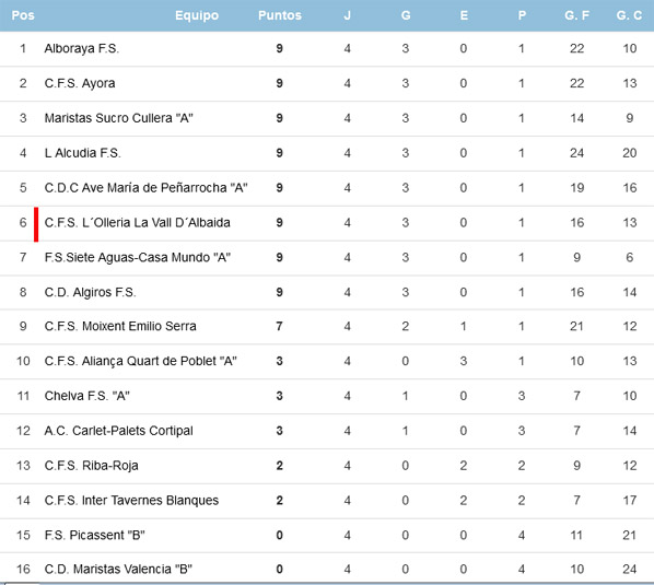 CFS l’Olleria està vivint un a lliga carregada d’emoció. Després de quatre jornades disputades, els 8 primers equips en la classificació empaten a 9 punts, un novè equip està a dos punts, i a partir d’aquest 9ºpuesto, es parteix la classificació amb sis punts de diferència. Amb la seva victòria aquest dissabte sobre el Chelva F.S. «A» per 3-1 (Jose F. Soler 28 ‘, Alexandre Mompó 35’ i David Moreno 37 ‘), els ollerians mantenen intactes les seves opcions de seguir lluitant pel liderat, malgrat que aquesta lliga tot just acaba de començar.