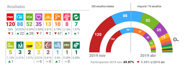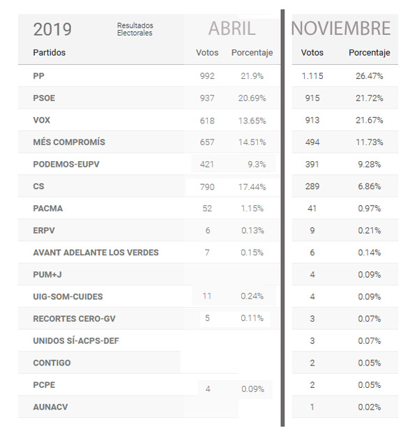 10N. Resultados electorales en l’Olleria y comparativa respecto a las últimas elecciones.