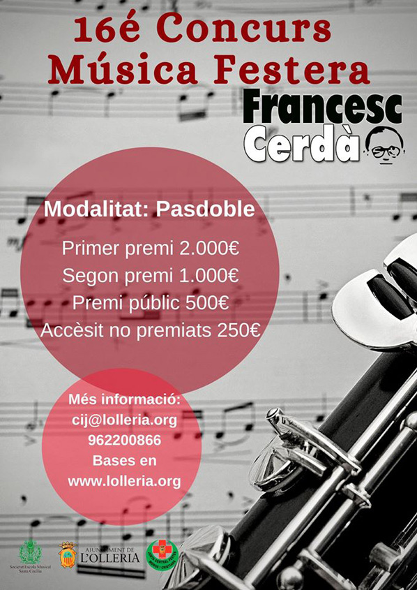 La Concejalía de Cultura del Ayuntamiento de l’Olleria juntamente con la Junta de fiestas y la Sociedad Escuela Musical Santa Cecilia del municipio, han organizado la 16 edición del Concurso de música festera “Francesc Cerdà” en la modalidad de “Pasodobles”.