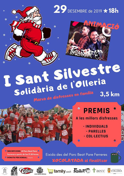 L’Olleria celebrarà el proper diumenge 29 de desembre la primera Sant Silvestre solidària. La cursa, començarà a les 18 h, des del Parc Beat Pare Ferreres, les inscripcions es podran realitzar a partir de les 17:30 h (donatiu per dorsal 1 €). La marxa serà de 3,5 km i tindrà tres categories de premis, a les millors disfresses per individual, parelles i col·lectius. Serà una festa eminentment familiar amb xocolatada a l’acabar la carrera i amenitzada per «Phjlantropic». Una tarda de festa per acomiadar l’any entre veïns amb una bona causa com a finalitat solidària. (Els donatius aniran a l’Associació Espanyola contra el Càncer).