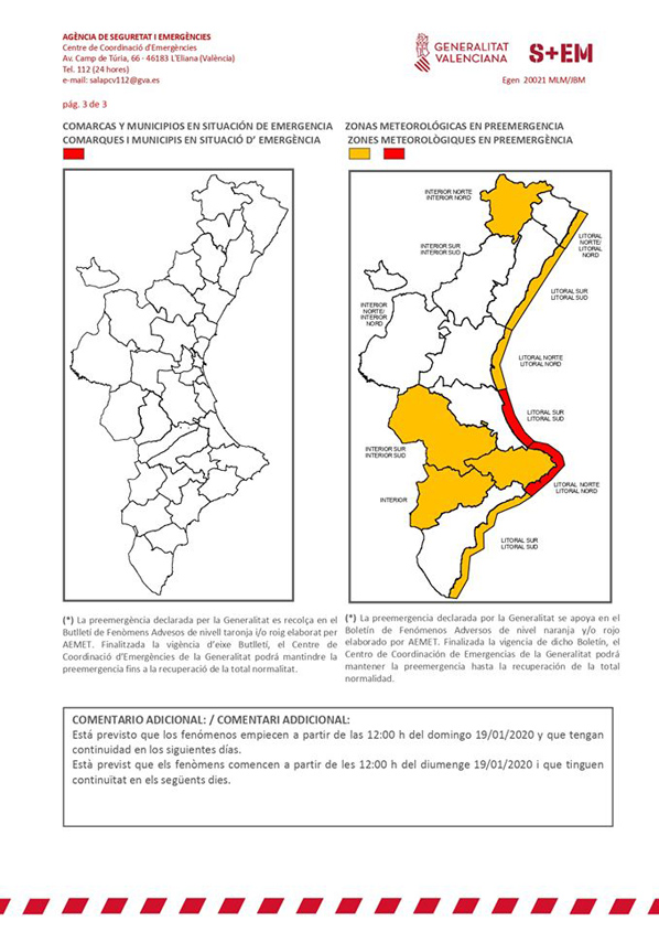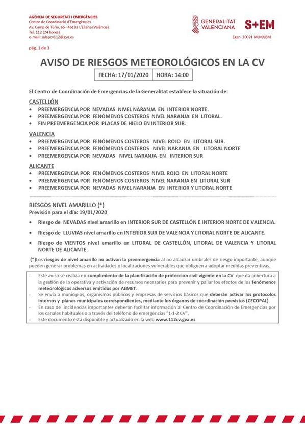 Según informa el 112, el Centro de Coordinación de Emergencias «emite aviso por temporal en la Comunidad. A partir del domingo 19 casi todas las zonas de interior se verán afectadas por la nieve; y las del litoral, por viento, lluvia y fenómenos costeros». La previsión de nieve afecta al interior de la Comunitat, en general, y se recuerda la comprobación del estado de las carreteras antes de hacer trayectos por la zona.