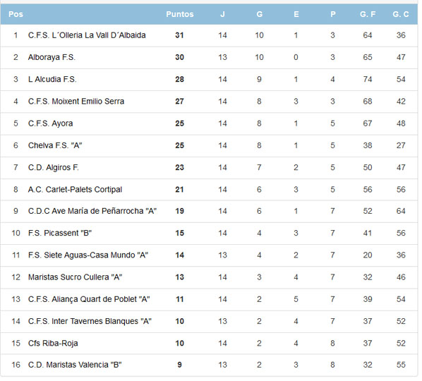 L’Olleria FS, torna a recuperar el liderat després de la seva victòria a casa de l’Ave Maria de Peñarrocha. Tot i que alguna trobada va ser suspès pel temporal, el cap de la classificació segueix molt oberta on aparentemete els vuit primers se’ls aprecia intenció de lluitar pels llocs d’ascens, d’ahi el meritori primer lloc dels ollerians que mantenen de moment seva pugna directa amb Alboraia i l’Alcúdia.