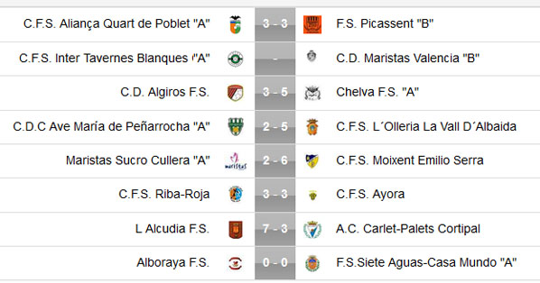 L’Olleria FS, vuelve a recuperar el liderato tras su victoria en casa del Ave María de Peñarrocha. A pesar de que algún encuentro fué suspendido por el temporal, la cabeza de la clasificación sigue muy abierta donde aparentemete los ocho primeros se les aprecia intención de luchar por los puestos de ascenso, de ahi el meritório primer puesto de los ollerienses que mantienen de momento su pugna directa con Alboraya y l’Alcudia.