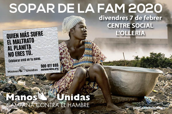 El próximo viernes 7 de febrero se celebrará el “sopar de la fam”, evento de Manos Unidas organizado por la Parroquia que tiene como objetivo la recaudación de fondos para alguno de los proyectos de ayuda que la agrupación internacional está llevando a cabo y que se explicaran durante el evento. El acto comenzará a las 21 h en el Centro Social con la presentación de la campaña y el “sopar”. A las 22 h “sainet” a cargo del grupo de teatro El Bunyol. y a las 22:30 h Rifa y canciones Scouts.