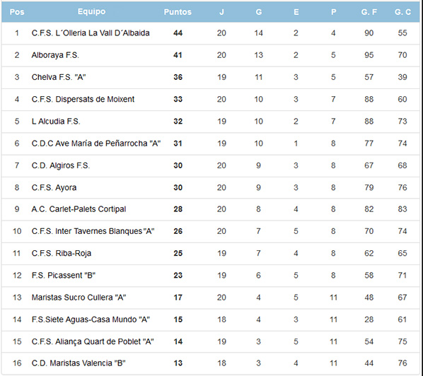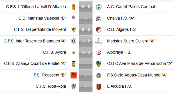 CFS l’Olleria acabarà aquesta jornada sent més líder que en l’anterior, gràcies a l’empat a domicili del seu immediat perseguidor, el Alboraia FS que «va arrencar» un punt a Ayora en l’últim minut. El que situa l’avantatge en tres punts i el «golaverage» particular a favor. La trobada on jugava el tercer classificat, va quedar ajornat. Ara mateix són els tres equips que presenten serioses aspiracions per ocupar les dues places d’ascens a onze jornades de la fi de lliga (18 punts en joc). En el quart lloc treu el cap Moixent, que ja comença a assetjar el tercer lloc que ocupa Chelva.