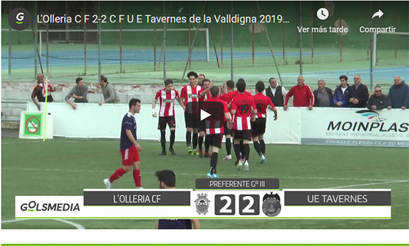 L’Olleria CF, va aconseguir «in extremis» empatar davant un dels aspirants a l’ascens, la UE Tavernes de Valldigna. A l’igual que fa dues jornades contra la UD Castellonense, no es va notar la diferència en la taula classificatòria, encara que en aquesta ocasió la Solana va gaudir d’una trobada entretingut en el qual es sucedian les ocasions a les dues porteries.