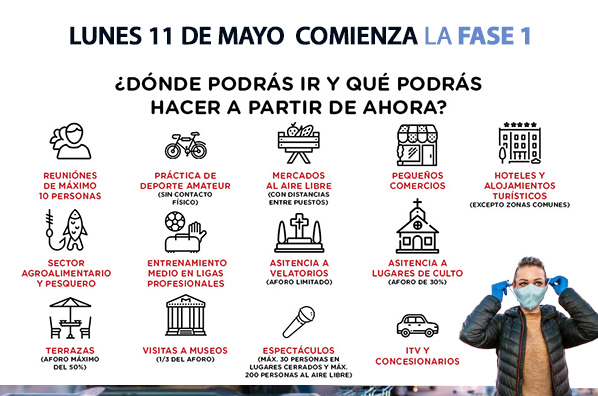 Aunque ya desde el pasado 4 de mayo se reabrieron los locales y establecimientos minoristas de menos de 400 metros cuadrados y con una atención al cliente individualizada y respetando la distancia interpersonal de dos metros y bajo cita previa, tal y como aparece reflejado en la orden ministerial recogida por el BOE. A partir de la fase 1, sin embargo, se permite la apertura generalizada de los locales y establecimientos comerciales «que no tengan carácter de centro o parque comercial» sin necesidad de cita previa. Además, el aforo estará limitado al 30 por ciento y continuando con la distancia de seguridad de dos metros entre clientes y, en caso de que esta medida no se pueda cumplir, solo se permitirá la entrada de un cliente por vez.