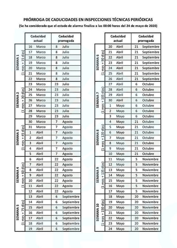 Con el objetivo de posibilitar la realización del elevado número de inspecciones que han quedado pendientes tras la declaración del estado de alarma, de forma que puedan compatibilizarse con la ejecución de las revisiones cuya validez expira en los próximos meses, la nueva orden ministerial prorroga la ITV, ampliándola en quince días naturales por cada semana transcurrida desde el inicio del estado de alarma hasta que se hubiera producido su vencimiento, conforme a lo dispuesto en el cuadro que aparece ilustrando esta información.