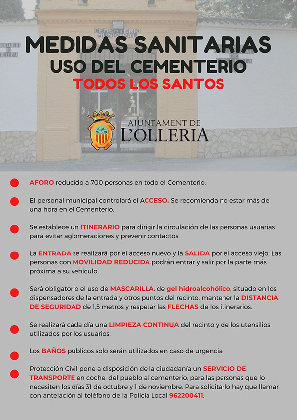 Protecció Civil posa a disposició de la ciutadania un servei de transport amb cotxe, del poble al cementeri, per a les persones que el necessiten els dies 31 d’octubre i 1 de novembre. Per a sol·licitar-ho cal cridar amb antelació al telèfon de la Policia Local 962200411.
