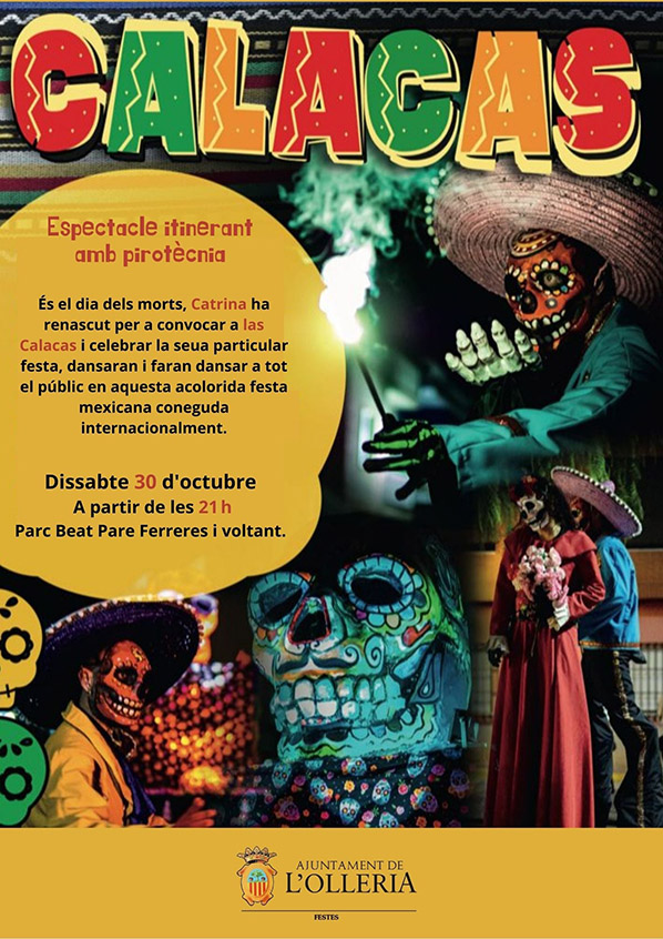 El Parc Beat Pare Ferreres acollirà aquest dissabte 30 d’octubre a partir de les 21 h l’espectacle itinerant CALACAS (per a totes les edats). Una activitat que combina diferents tècniques de teatre, animació, dansa i ús de la pirotècnia, on els actors aniran en xanques per a donar la màxima visibilitat i espectacularitat.