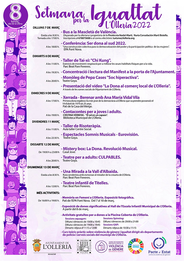 Monòleg, Contacontes, Bus a la Mascletà de València, Taller de Tai-xi, una ruta senderista, una Mistery Box per a joves, xerrades, teatres, exposicions, activitats esportives i espectacles, són algunes de les activitats amb les quals podrem commemorar aquesta setmana per la igualtat al municipi.