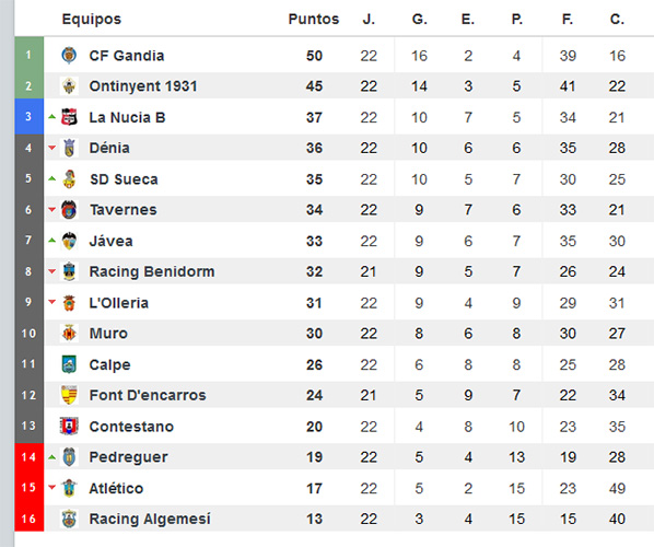 El resto de la jornada además de dejar al líder, más líder, cuenta con el «pinchazo» de Ontinyent 1931. Lo que podía ser una jornada en la que los de Ontinyent empatasen en la tabla con los de Gandía, acabó con una diferencia de cinco puntos, eso sí el segundo puesto en solitario, tan sólo amenado por La Nucia B, que está en racha pero se mantiene a 8 puntos de los puestos de «play off». La parte baja que hace un par de jornadas parecía definida, recupera la emoción, con un Contestano que no ha sido capaz de huir de ella y ya siente la presión de sus dos inmediatos perseguidores. Del resto de equipos, L’Olleria baja al 9º puesto. Y tan sólo la SD Sueca y el Jávea han aprovechado la jornada para asediar la tercera plaza de promoción que ocupa La Nucia B.